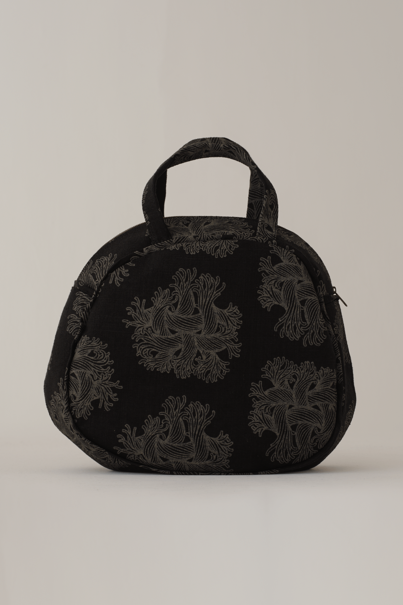 - 総柄プリントリネンを使用したハード構造のラウンドバッグ