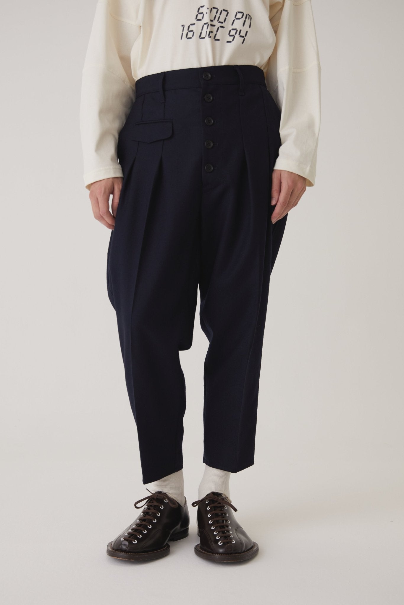 本アイテムは「Wool Serge 450(ハリのある質感)」と「450CS(より柔らかい質感)」の2種類の生地で展開しています。両者はほぼ同一の素材で、質感にわずかな違いがあるのみです。